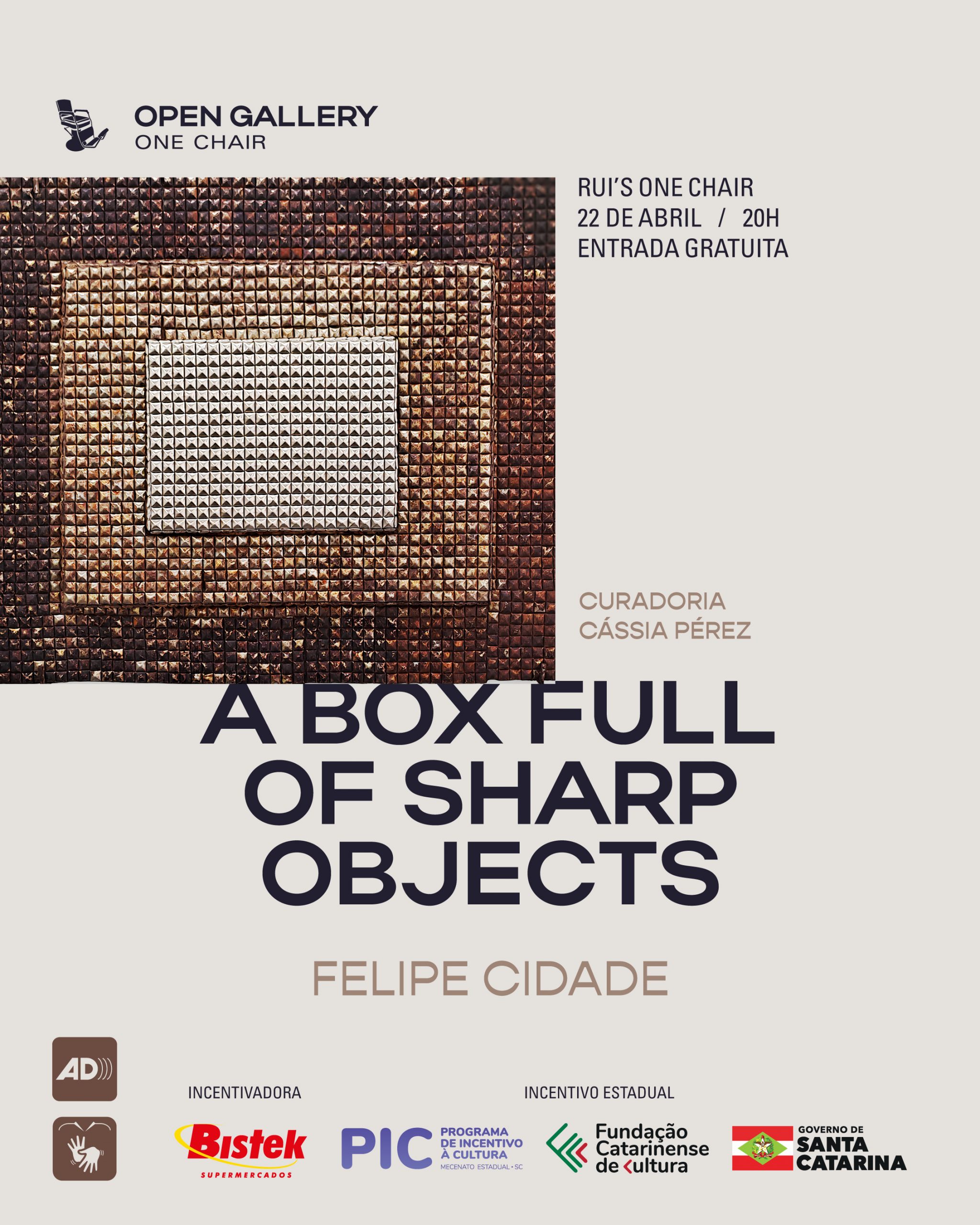 Artes visuais em destaque. Nesta quarta-feira, dia 22 de abril, o espaço cultural One Chair, no bairro Vila Nova, em Blumenau, recebe pela primeira vez o artista Felipe Cidade (SP) na temporada de exposições do Projeto Open Gallery (galeria aberta). Com curadoria da doutora e crítica de arte, membro da Associação Brasileira de Críticos de Arte (ABCA), Cássia Pérez, a exposição A Box Full of Sharp Objects, de Felipe Cidade, propõe reflexões sobre o cotidiano a partir da ressignificação de objetos comuns, adaptados para instigar discussões que extrapolam as fronteiras da arte e alcançam campos sociais, institucionais e políticos. O evento é gratuito e aberto à toda comunidade e ocorre às 20h. Conta com apresentação do duo Fevereiro Sounds (Jaison Malungo e DJ Leokdio); com intérprete de LIBRAS e audiodescrição (AD).