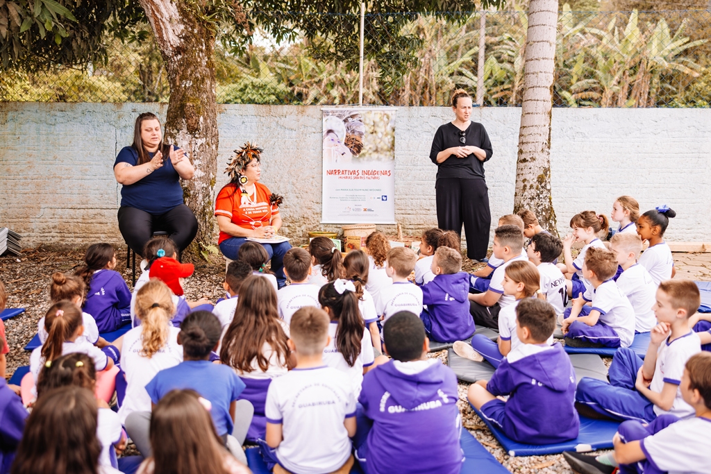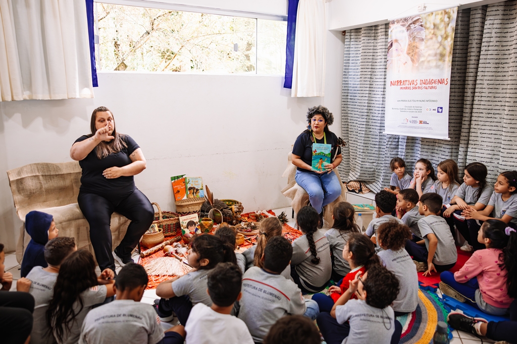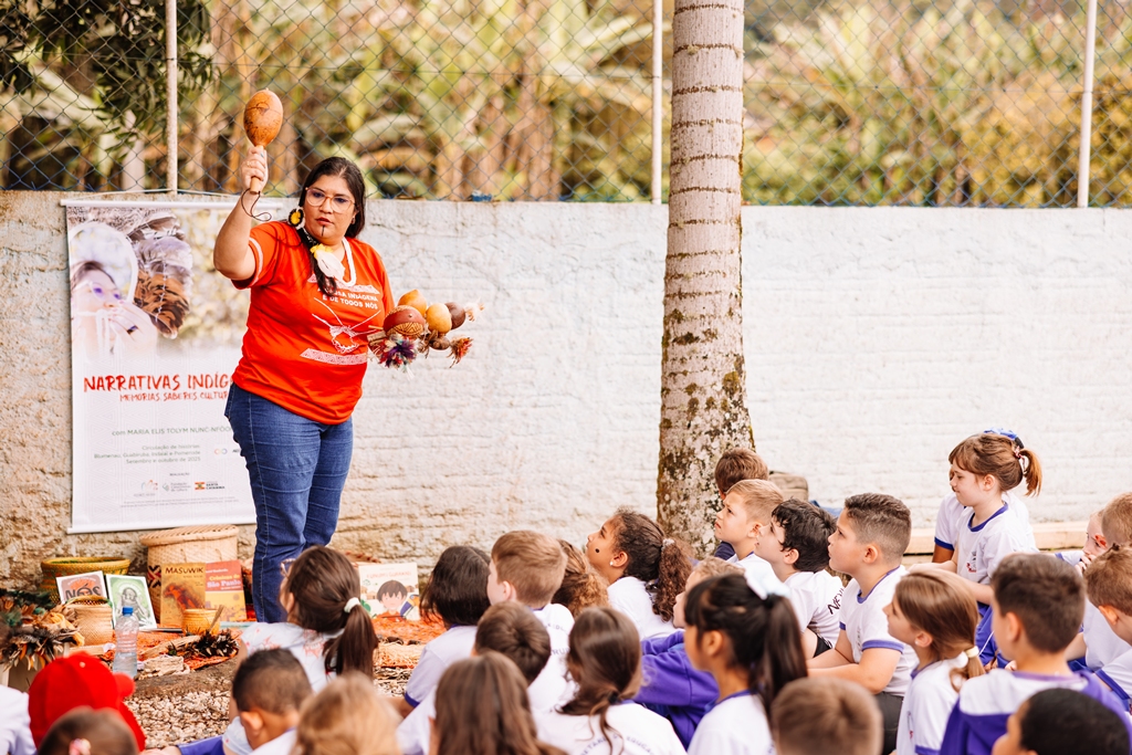 Povos indígenas em destaque. Neste mês, cerca de 400 pessoas prestigiaram a circulação do projeto Narrativas Indígenas: Memórias, Saberes, Culturas, da pesquisadora, contadora de histórias e educadora indígena Maria Elis Nunc-nfôonro. O projeto circulou pelos CEI Professor Rudolf Hornburg, em Pomerode; EBM Profª Alice Thiele, em Blumenau; na APAE e na EBM Professor Arthur Wippel, em Guabiruba; e no Colégio Municipal de Indaial. Todas as ações foram gratuitas, com tradução simultânea em LIBRAS, visita sensorial tátil e contou com uma apresentação com audiodescrição (AD). Como contrapartida social, o projeto prevê ainda uma palestra sobre Literatura e Diversidades Indígenas, com Maria Elis Nunc-nfôonro, no dia 6 de outubro, às 19h, no Instituto Federal Catarinense (IFC) – Campus Blumenau, com entrada gratuita e aberta à comunidade.