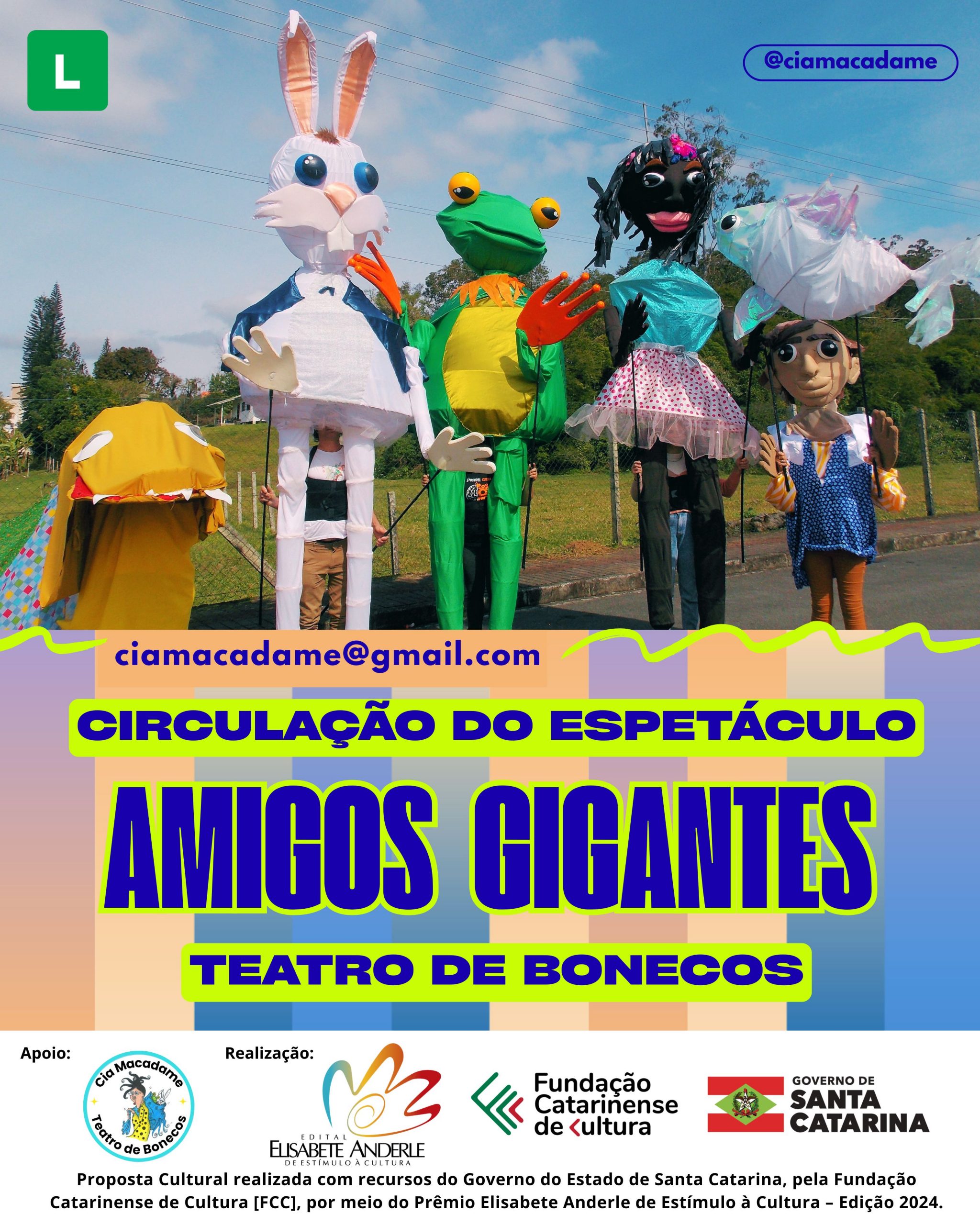 Teatro popular, arte, memória afetiva, inclusão e bonecos de três metros de altura em destaque. Até novembro deste ano, escolas públicas e instituições sociais de Blumenau, Gaspar e Guabiruba recebem a circulação do projeto Amigos Gigantes, espetáculo que utiliza como atores bonecos gigantes (3,5m) que contam histórias por meio de seis personagens: Tainha Voadora, Bento, Zazau, Sapo Di, Coelho Jorel e Bernunça. No total, serão 10 apresentações. Em Blumenau, o espetáculo chega à Casa de Acolhida São Felipe Néri, nesta quarta-feira, dia 24 de setembro; na Casa de Repouso São Simeão, no dia 4 de outubro; e na Escola Básica Estadual Hercílio Deeke, no dia 8 de outubro. Em Gaspar, a circulação acontece na Escola Básica Estadual Frei Policarpo, no dia 22 de outubro. Em Guabiruba, as apresentações ocorrem na Escola Básica Municipal João Jensen, no dia 5 de novembro; e na Escola Básica Municipal Profº Carlos Maffezzolli, no dia 12 de novembro. Com produção e realização da Cia Macadame, o projeto conta com produção geral e direção de Rafael Leandro e Priscila Gilinski, idealizadores do projeto. Com classificação indicativa LIVRE e tradução em LIBRAS, todas as ações são gratuitas e voltadas para alunos e educadores das instituições contempladas.