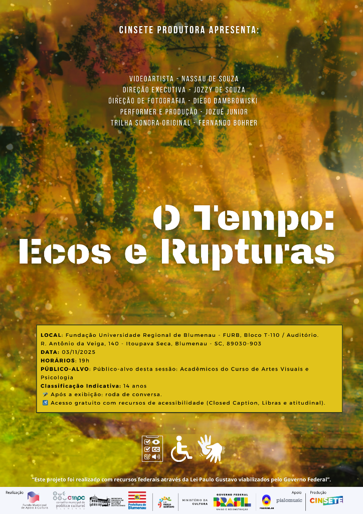 Cinema experimental em destaque. No dia 3 de novembro, a Universidade Regional de Blumenau (FURB) recebe a exibição da videoarte O Tempo: Ecos e Rupturas, do artista Nassau de Souza. O evento ocorre às 19h, com entrada gratuita. A ação é voltada para acadêmicos do Curso de Artes Visuais e Psicologia e é aberta ao público geral. Conta com roda de conversa com a equipe de produção da obra após exibição; além de acessibilidade em LIBRAS, áudio descrição (AD) e legendas descritivas. Com produção da Cinsete Produtora, a videoarte conta com criação, direção do artista Nassau de Souza; direção executiva de Jozzy de Souza; direção de fotografia do cineasta Diego Dambrowski; performer e produção de Jozué Junior e trilha sonora original de Fernando Bohrer. Classificação indicativa 14 anos.