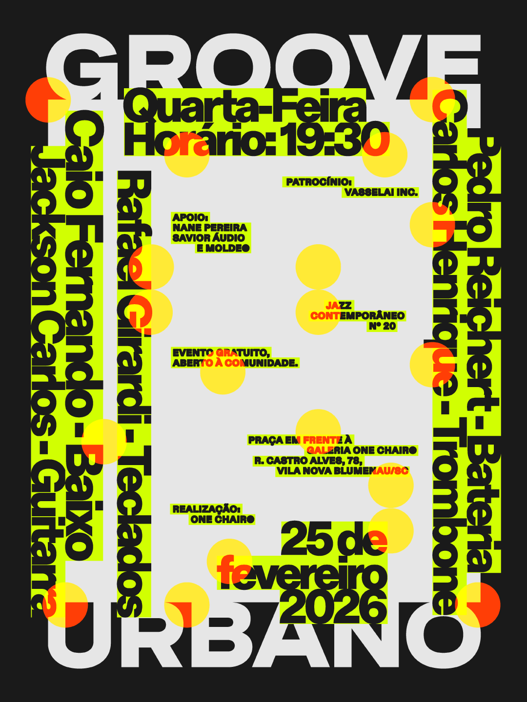 Jazz contemporâneo na praça. No dia 25 de fevereiro, a Praça do Rotary, em frente ao Rui’s One Chair Barber, no bairro Vila Nova, em Blumenau, recebe a primeira apresentação do ano do Projeto Groove Urbano. O concerto de música instrumental ocorre a partir das 19h30 e conta com os músicos base do projeto Caio Fernando, no baixo, e Jackson Carlos, na guitarra; e participação especial de Pedro Reichert, na bateria; Carlos Henrique, no trombone; e Rafael Girardi, no teclado. No repertório de músicas tocadas estão obras como: Asa (Joabe Reis), Change of the Guard (Kamasi Washington), Mechanisms (Corto Alto), Yenne (Young Jazz Giants), Spirit Waltz (Nat Reeves), entre outras. Com realização de Rui’s One Chair Barber, o projeto conta com o patrocínio da Vasselai Inc. O concerto é gratuito e aberto à toda comunidade; é indicado ao público levar suas cadeiras de praia e ou banquinhos e, em caso de tempo instável, levar guarda-chuva.