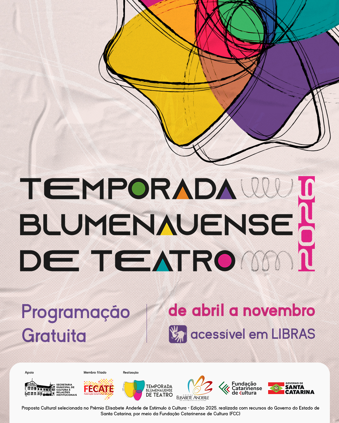 O projeto Realização e Manutenção da Temporada Blumenauense de Teatro (TBT) – Edição 2026 – é uma proposta cultural selecionada pelo Prêmio Elisabete Anderle de Estímulo à Cultura – Edição 2025, realizada com recursos do Governo do Estado de Santa Catarina, por meio da Fundação Catarinense de Cultura (FCC). Acompanhe as novidade pelo www.instagram.com/temporadablumenauensedeteatro