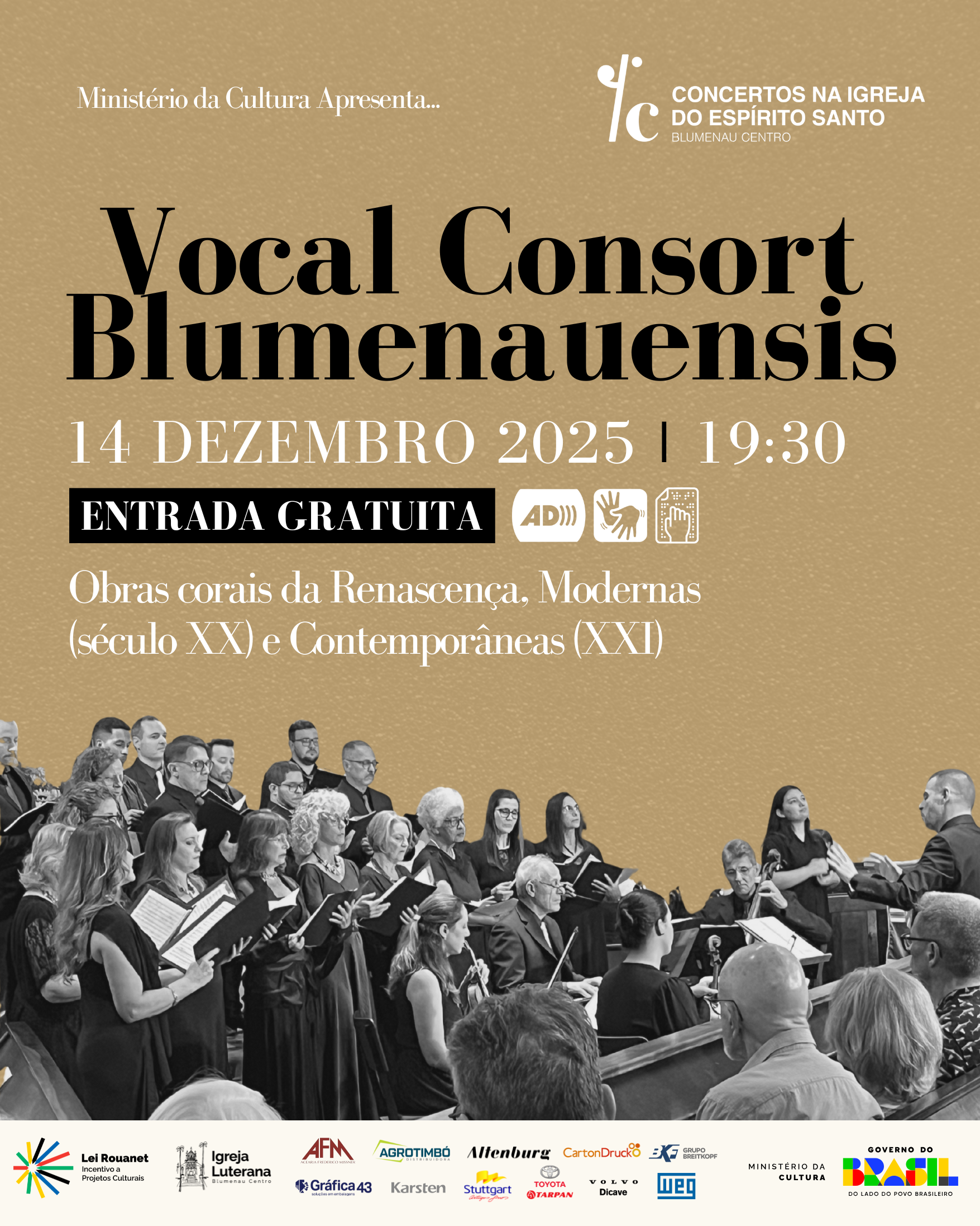 “Esse é o último grande concerto da temporada e fecha com chave de ouro esse ano do programa que nesta edição trouxe para a cidade um total de oito grandes concertos. O Vocal Consort Blumenauensis é um grupo de produção de alto nível, produção vocal, inclusive, onde grande parte dos integrantes são da própria comunidade, que tem a oportunidade de se apresentar ao grande público”, declara o produtor cultural Rodrigo Dal Molin, à frente da Verbo Projetos.