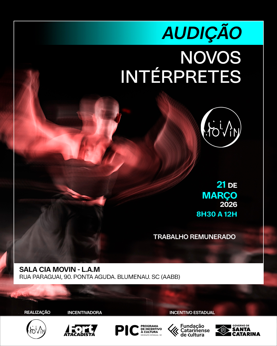 Dança em destaque. A Companhia de Dança Contemporânea, Cia MOVIN, está com inscrições abertas para a seleção de três intérpretes que irão compor o escopo de dançarinos da companhia. A audição presencial ocorre neste sábado, dia 21 de março, às 8h30, na Sala Cia MOVIN + L.A.M, localizada na Associação Atlética do Banco do Brasil (AABB), no bairro Ponta Aguda, em Blumenau. O processo de seleção será composto por análise das inscrições, audição presencial e avaliação artística e os interessados podem se inscrever gratuitamente pelo link https://forms.gle/eMJgNX8pfzNFQkpb7 até o dia 20 de março. As vagas são para intérpretes maiores de 18 anos.