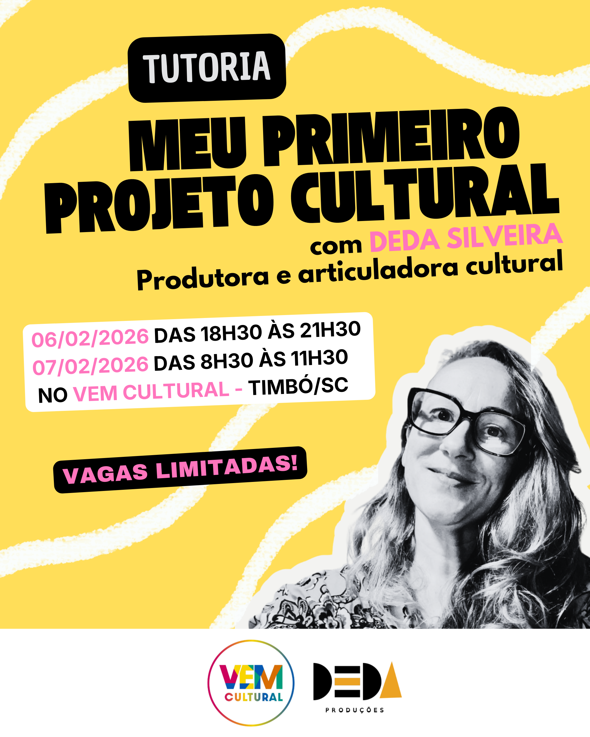Formação em produção cultural. Em fevereiro, Timbó receberá a oficina “Tutoria Meu Primeiro Projeto Cultural”, formação para quem pretende inscrever seu primeiro projeto ou trabalhar em projetos culturais, ministradas pela produtora cultural Deda Silveira. A ação será realizada nos dias 6 e 7 de fevereiro, no VEM Cultural Espaço Multicultural e Escola de Artes. O valor do investimento é R$350,00 e a ação é voltada para agentes, artistas e comunidade interessada, acima de 18 anos.