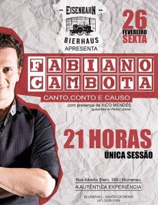 Diversão garantida. No dia 26 de fevereiro, sexta-feira, o músico e comediante Fabiano Cambota estará no gastropub Eisenbahn Bierhaus. Cambota é vocalista da banda Pedra Letícia e responsável também pelas letras divertidas do repertório da banda. Toca violão, pandeiro, viola, cavaquinho e já participou dos programas Domingão do Faustão, Programa do Jô, Turma do Didi, entre outros. Ele divide o palco com grandes humoristas do Brasil e tem se destacado, tanto na música quanto no stand-up comedy. O Eisenbahn Bierhaus fica localizado no Setor 4 do Parque Vila Germânica, no piso 1, em Blumenau. Ingressos podem ser adquiridos no Empório São Jorge, do Parque Vila Germânica, e o primeiro lote é promocional, no valor de R$ 35,00, com direito a um voucher para dobrar o primeiro chope pago no dia do evento. O stand-up ocorrerá às 21h, em única sessão.