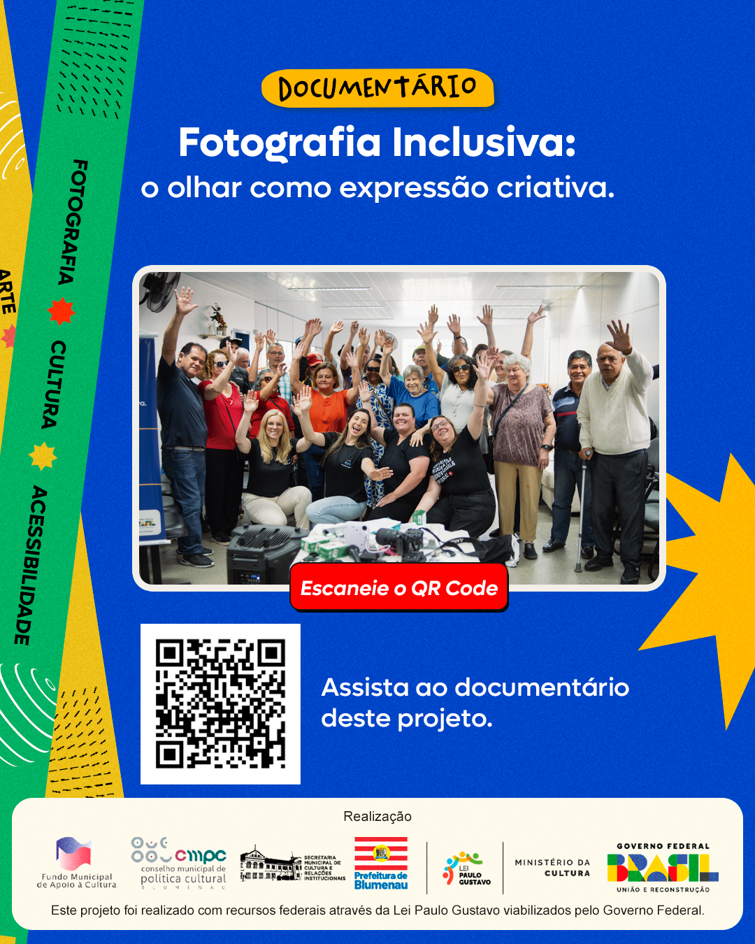 A obra é uma contrapartida social do projeto cultural “Fotografia Inclusiva: O Olhar Como Expressão Criativa”, aprovado pelo Edital de Chamamento Público SMC Nº 05/2024, LPG Blumenau. Acompanhe as novidades pelo www.instagram.com/helobeckhauser
