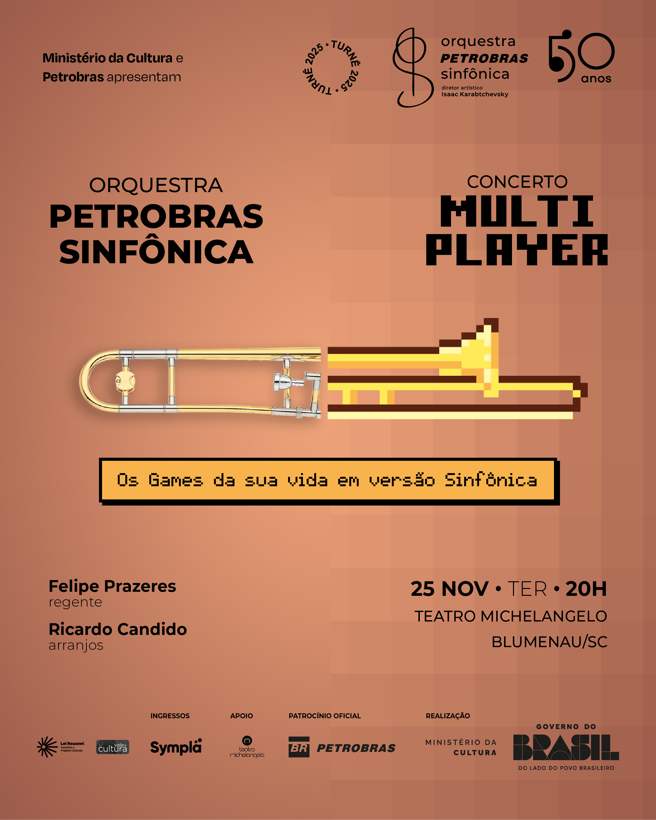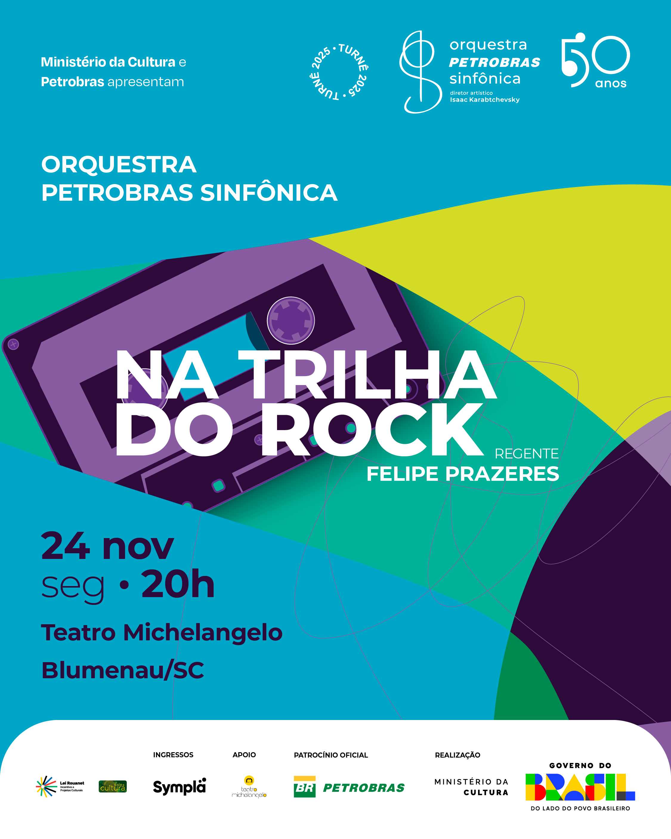 Sinfonia, clássicos do rock, trilhas sonoras do universo gamer e celebração em destaque. Nos dias 24 e 25 de novembro, Blumenau recebe pela primeira vez a Orquestra Petrobras Sinfônica (RJ) no palco do Teatro Michelangelo. Sob a regência do maestro Felipe Prazeres, no dia 24, segunda-feira, a orquestra apresenta o concerto Na Trilha do Rock, com arranjos sinfônicos de clássicos do rock nacional; e no dia 25, terça-feira, é a vez do espetáculo Concerto Multiplayer, que mergulha no universo dos videogames com trilhas sonoras marcantes transformadas em versões orquestrais. As apresentações ocorrem às 20h e os ingressos já estão disponíveis na plataforma Sympla, entre R$10 e R$40, cada. Classificação indicativa LIVRE.