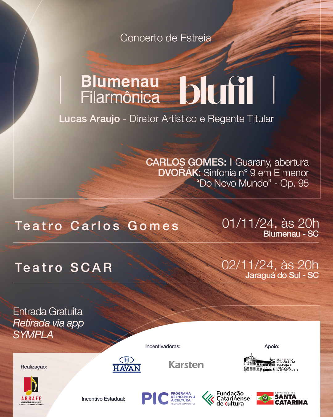 Música sinfônica em concerto histórico. No dia 1º de novembro, a cidade de Blumenau recebe o primeiro concerto da Blumenau Filarmônica, projeto idealizado pelo maestro e diretor artístico Lucas Araujo em parceria com a ABBAFE, e com produção executiva do trombonista e produtor cultural André Chiomento. A orquestra, regida pelo maestro Araujo, conta com mais de 50 instrumentistas nacionais e locais. A apresentação ocorre às 20h, no Auditório Heinz Geyer, do Teatro Carlos Gomes, e os ingressos são gratuitos, com reserva antecipada pelo Sympla https://bit.ly/3NizTm2