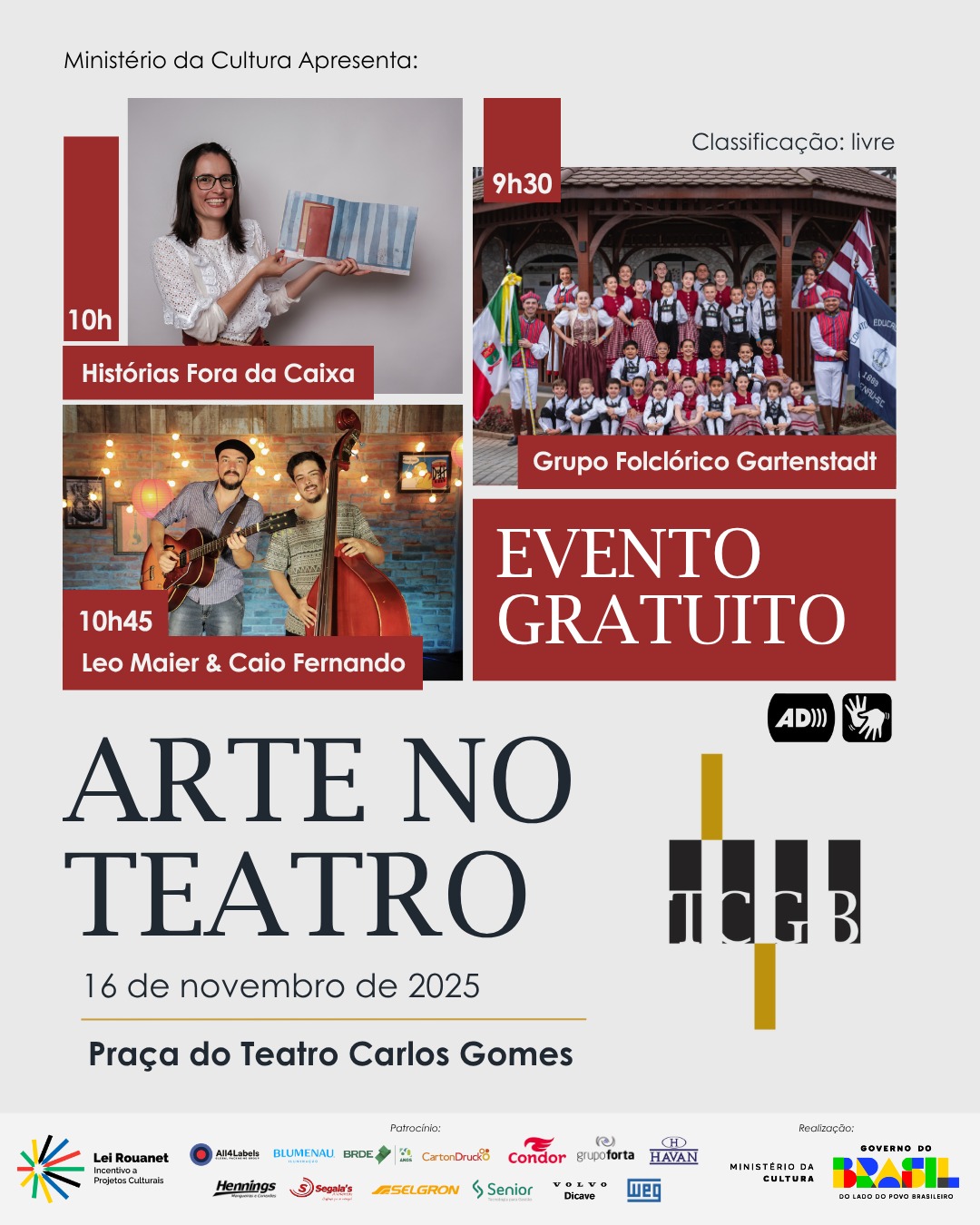 Manhã de teatro, dança e música em Blumenau. No dia 16 de novembro, domingo, o Teatro Carlos Gomes Blumenau (TCGB) promove o evento cultural Arte no Teatro, com três atrações gratuitas e abertas à comunidade. A programação inicia às 9h30 com apresentação dos grupos infantil e juvenil do Grupo Folclórico Gartenstadt; logo em seguida, às 10h, traz o espetáculo de teatro infantil Histórias Fora da Caixa, com a atriz Natália Curioletti; e às 10h45, o público pode prestigiar o show Do Blues ao Jazz, do duo Leo Maier & Caio Fernando. Todas as ações ocorrem na Praça e no Salão Centenário do TCGB, têm classificação indicativa LIVRE e contam com tradução em LIBRAS e Audiodescrição (AD). Em caso de tempo instável, todas as ações ocorrem dentro do Salão Centenário.